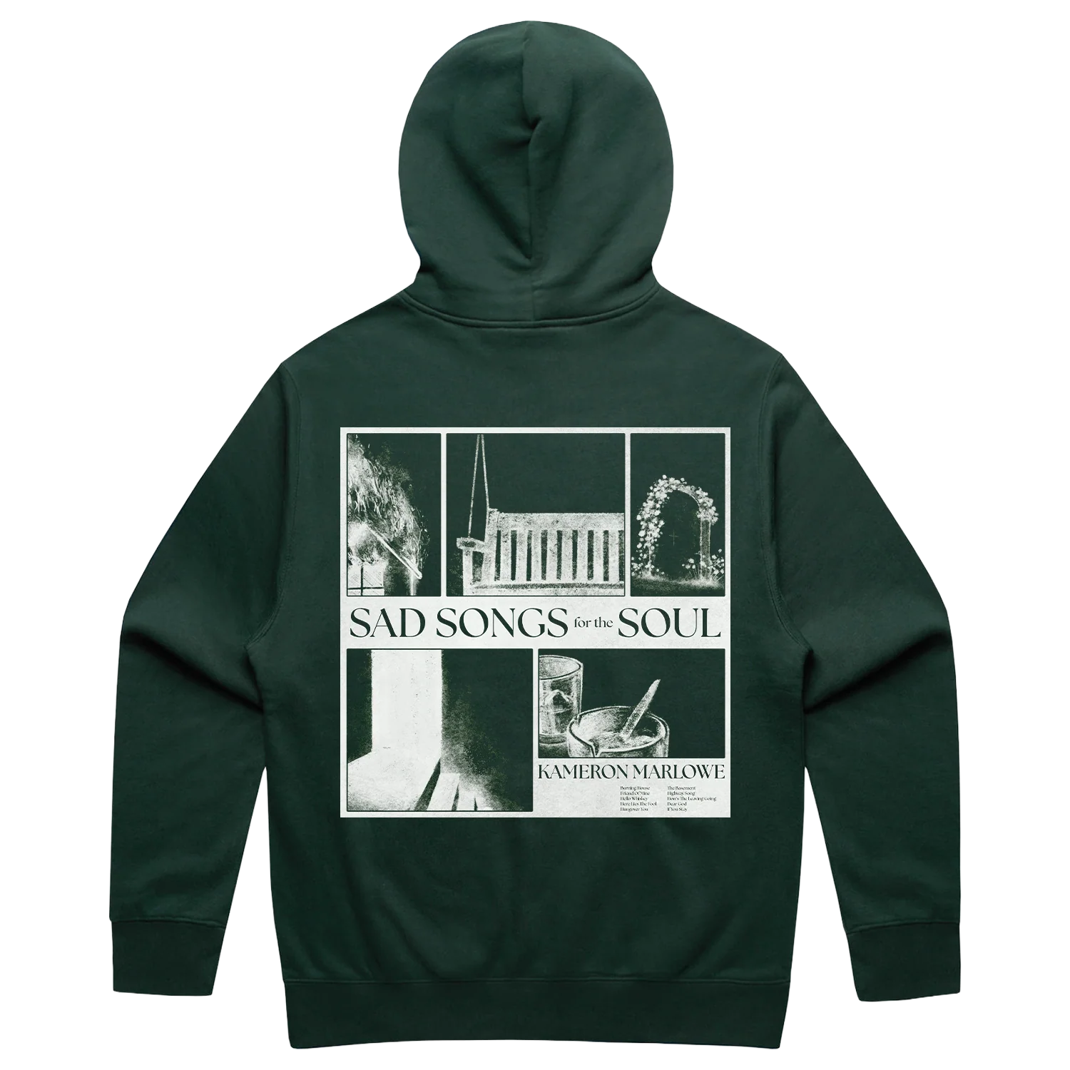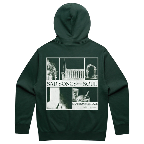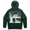 Printed on a relaxed mid-weight 80% cotton/20% recycled polyester CVC fleece hoodie in green.