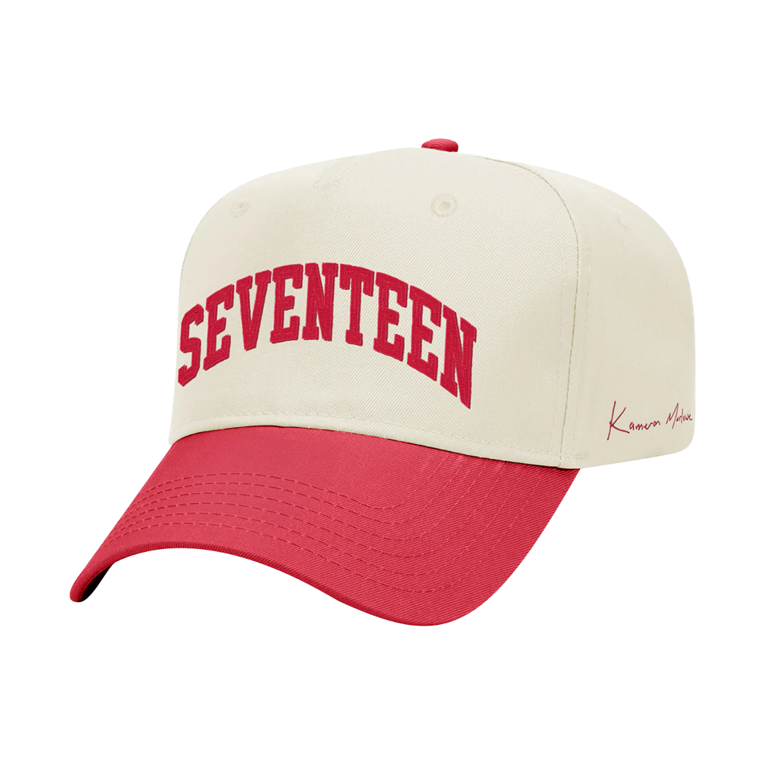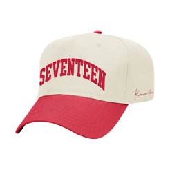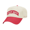 Embroidered front and side design on a 65/35 poly/cotton 5-panel, structured, mid-profile baseball hat in red/natural.